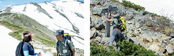 左)登山道ですれ違った白馬山案内人のひとりと会話を交わす松本さん。