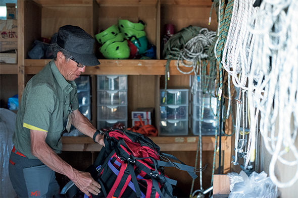 救助隊の装備品には登山道具からレスキュー用具までが揃う