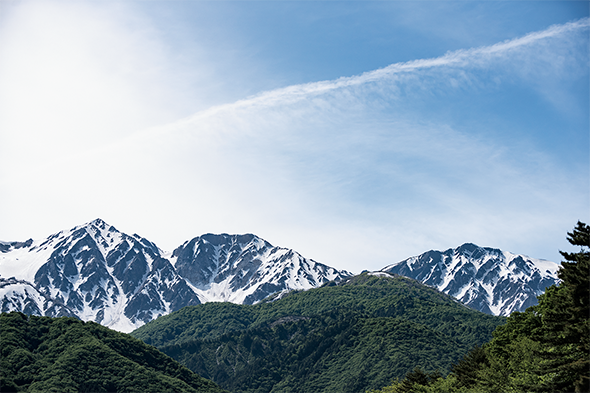 残雪が山肌のコントラストを深め、麓は鮮やかな緑に覆われる。白馬は1年で最も美しい時期を迎えていた