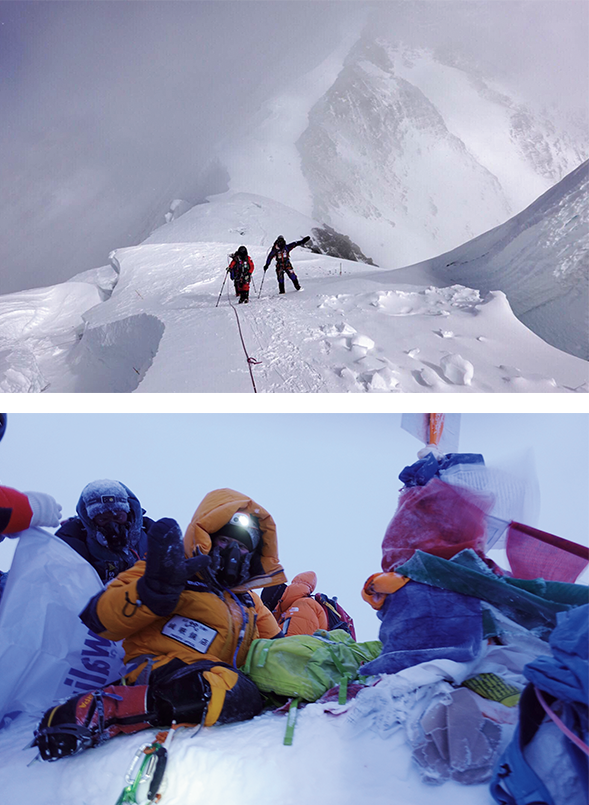 上)2017年5月27日、8848mのエベレスト山頂にて。予報に反して雪の舞う山頂だったが登れてなにより。下)ノースコルのC1、7020m付近まで下る。下山時はさらに天候が悪化していった